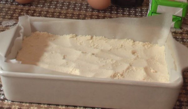 - Сухое «тесто» поделить на 3 равные части, первую – распределить на дне, застеленной пергаментом и смазанной маслом, формы.
