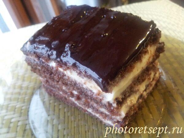- Промазываем каждый корж кремом, не забывая обрабатывать бока торта. «Шапку» десерта можно украсить какао-порошком или сахарной пудрой.