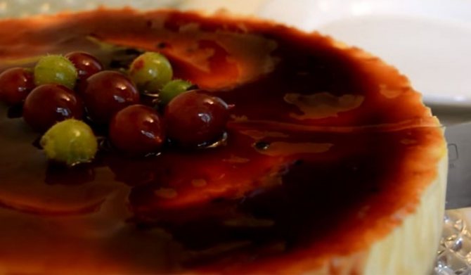 - На верх остывшего чизкейка можно выложить нарезанные фрукты и залить их желе для торта (инструкцию по приготовления желе смотрите на его упаковке). Это нужно сделать до того, как вы извлечете десерт из формы.