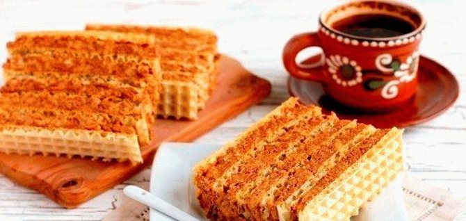 Имея в запасах упаковку вафельных коржей и баночку сгущенного молока, вы можете в любой момент сделать очень вкусный торт. Его основой будут коржи из вафель, а крем делается буквально за несколько минут из карамели, смешанной со сгущенкой и сливочным маслом. Если сверху полить торт растопленным шоколадом и украсить орешками, он приобретает вполне презентабельный вид и может конкурировать с любым десертом.