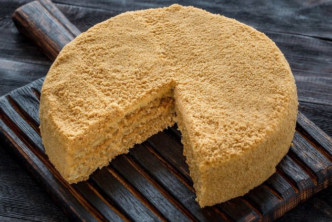 - Медовик тщательно вымазывают кремом и посыпают натертым коржом.