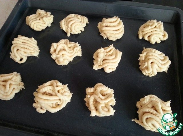 Как только закончится тесто (или заполнится противень) , печенье отправляется в духовку, разогретую до 180 градусов, на 15-20 минут.