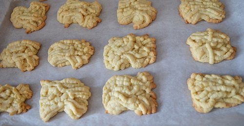Затем отрывайте кусочки теста и пропускайте их через мясорубку. Выкладывайте на противень, формируя печенье. Печем при температуре 190 градусов 15 минут до золотистого цвета.