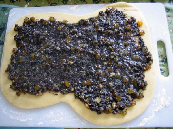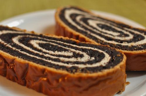 - Праздничный бисквитный или медовый рулет допустимо дополнить ароматной начинкой с пряностями. Необходимые продукты выглядят так: пара ст.л. меда и две ч.л. сока лимона, немного ванили, стакан зерен, по 0,5 ст. изюма без косточек и любимых орехов. Остывший распаренный мак нужно перетереть в ступке до белого состояния, а сушеный виноград и орехи измельчаются в блендере (или мясорубкой). Все соединяется, а при помощи лимонного сока нужно регулировать консистенцию наполнения выпечки;