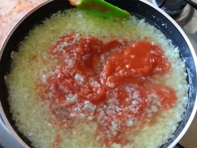 6. Тем временем лук дошел до нужной кондиции и пора к нему влить томатный соус.