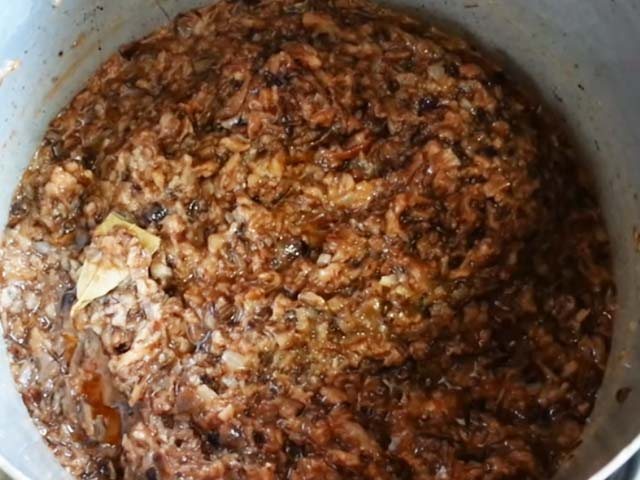 8. Выложить лук с томатом в кастрюлю с грибами, добавить лавровый лист. Посолить по вкусу и все перемешать. Тушить на небольшом огне 1,5 часа. В течении этого времени массу следует перемешивать несколько раз.