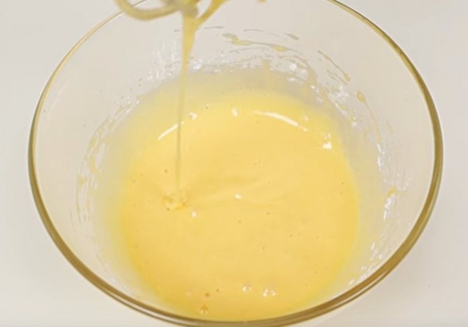 - Вливаем в яичную смесь растопленное и остывшее сливочное масло.