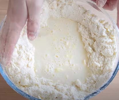 Вливаем 0,5-1 стакана теплого молока и все тщательно вымешиваем.
